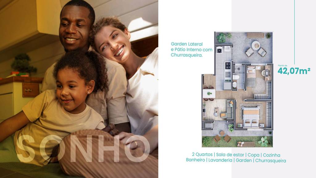Com apartamentos modernos de 2 quartos, com ou sem churrasqueira e opção de garden, o Kentucky foi pensado para quem sonha em ter um lar completo, com tudo o que precisa ao alcance.